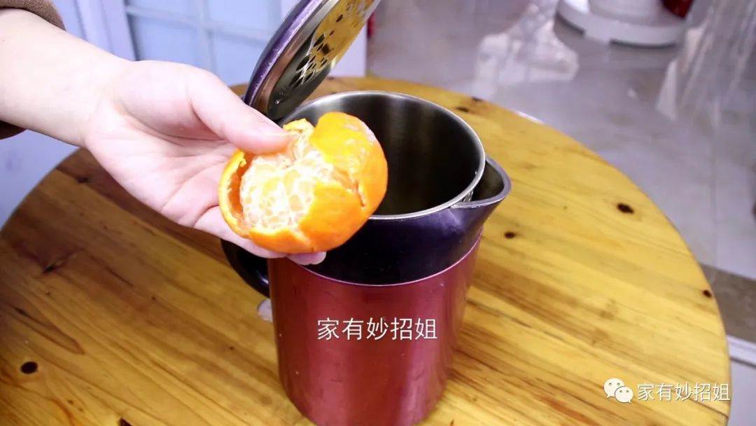 然后再準備一個橘子,將橘子皮剝下來后直接放進水壺中。要是家里沒有橘子的話,也可以用檸檬來代替。