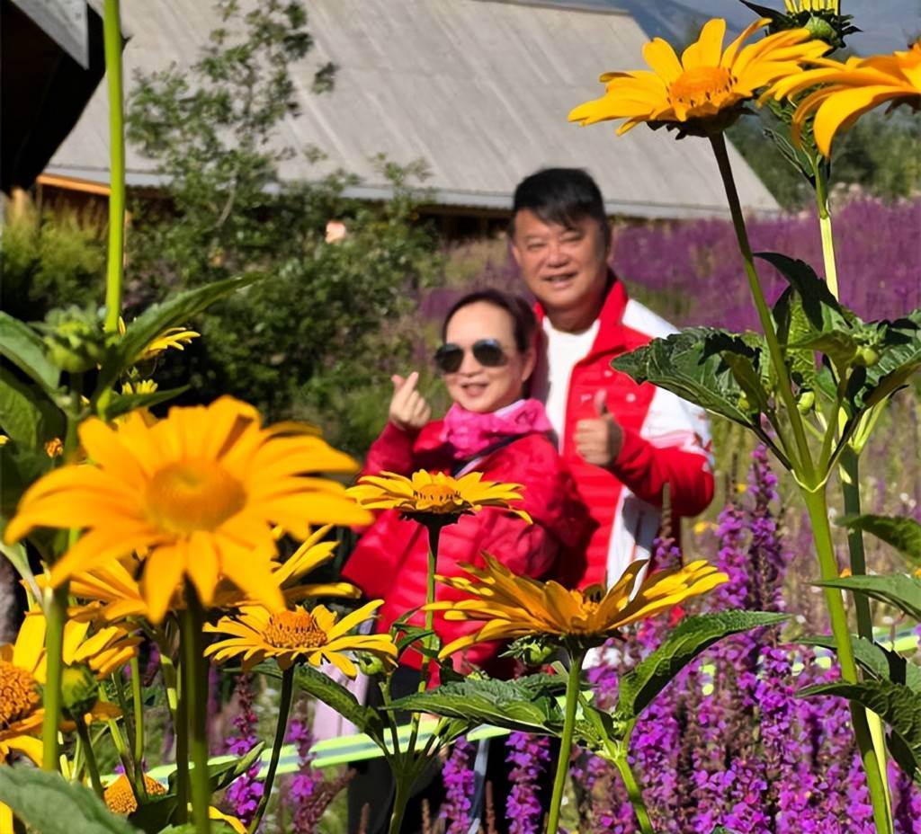 在公開的照片中,陳百祥和黃杏秀或是坐在湖畔,或是站在花海中,相依相偎,拍下了浪漫的瞬間。