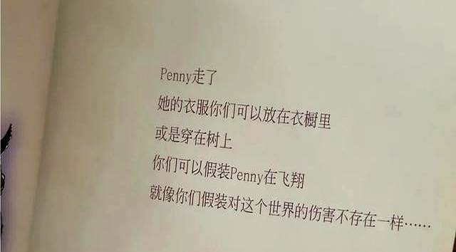 她詩集里還有一段,講叫penny的人走了,衣服可以放在衣柜里,也可以掛在樹上,大家假裝penny還在飛翔。
