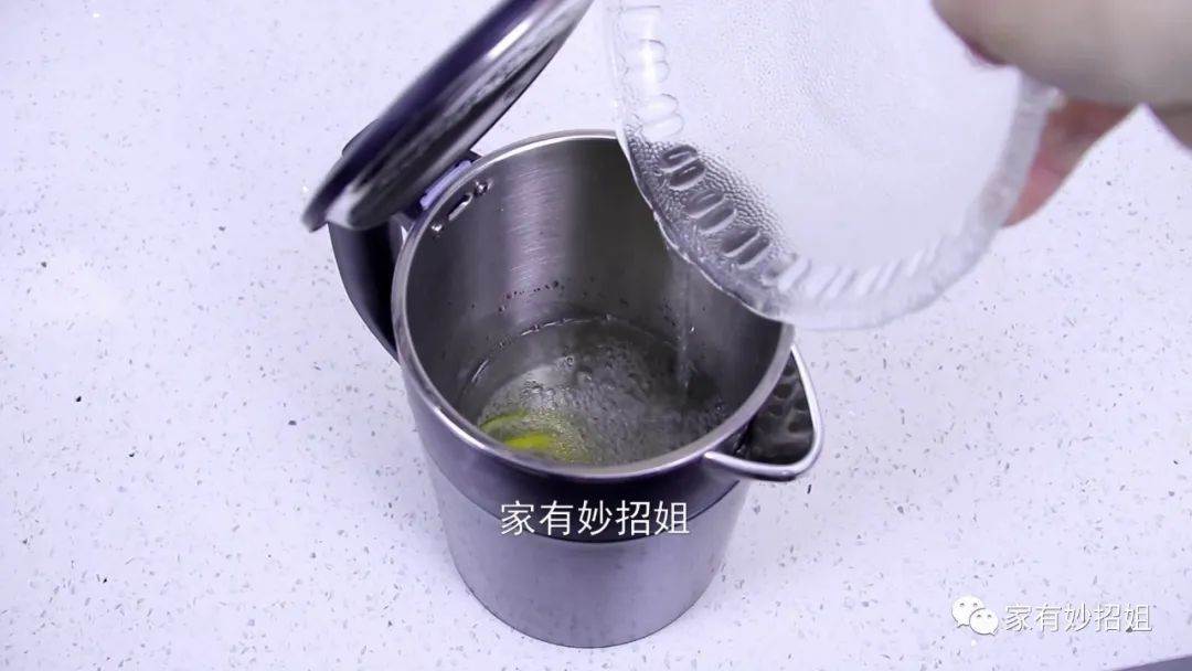 接下來我們再把水壺通上電,將水壺里面的水燒開來。白醋里面的醋酸是呈酸性的,而水垢是呈堿性的一個狀態,酸堿中和,水壺里面的水垢就會被溶解掉了,而檸檬的清香可以起到去除水壺異味的作用。