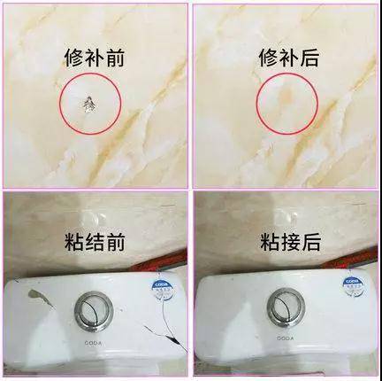 這兩款除了可以粘被磕壞的大理石瓷磚,還可以用剩余的美下台面的直角縫,修補瓷磚很方便,操作簡單,兩三個小時就可凝固,凝固后很硬,比瓷磚還硬,補大洞補小洞都不錯,干了之后還有亮面的效果,摸上去質感和瓷磚一樣。