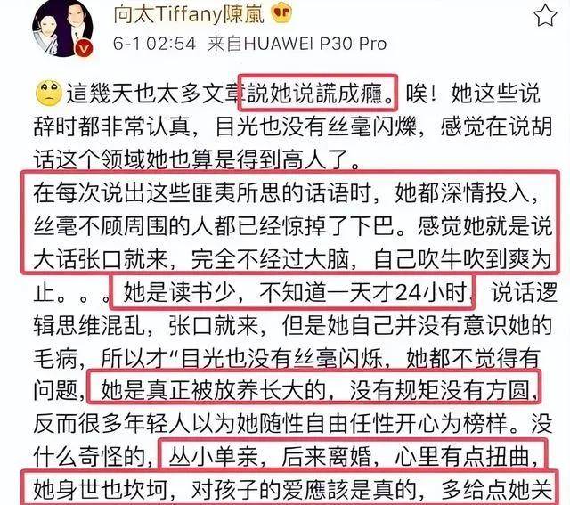 向太也不念當年舊情,公開指責張柏芝「撒謊成性」「耍大牌」「忘恩負義」,將其「拉黑」并宣稱「永不錄用」,這些負面指責一度讓張柏芝名聲嚴重受損。