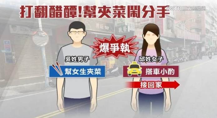 據《ETtoday》報導,35歲的邱女跟36歲的吳姓男友,17日跟一群友人在新莊的餐廳聚餐,結果男友在吃飯期間,夾菜給另一名同桌的女性朋友,讓邱女一看氣炸,認為這樣的行為是不合格的男友,便搭乘計程車去令一個地方喝酒,吳男髮現女友不見後,一直打電話找人,最後得知位置後,馬上開車過去接人,結果女友根本沒氣消,不斷在大街上失控質問:「為什麼幫別人夾菜!」雙方爆發口角衝突。