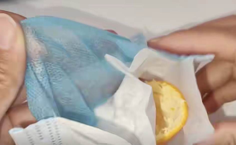 我們可以拿一個口罩,將其一邊剪開,然后將橘子皮放入口罩的一邊,將食鹽放入另一邊,并用繩子扎緊口罩。