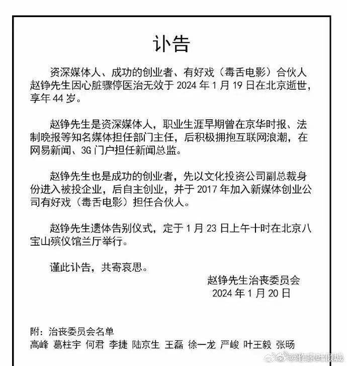 不過,近日卻傳出趙錚因為心肌梗塞爆發,送醫搶救7天後,仍于本月19日撒手人寰的消息,享年44歲,讓大眾都非常吃驚。而他身為作家的妻子陳晨也于稍早發文證實此事,並對亡夫深情告白,「在44年的人生中,他把17年給了我和女兒。這17年,也是我最刻骨銘心、最美好的17年。感謝他,送了我一場17年無與倫比的美夢」,字句悲痛,令人動容。