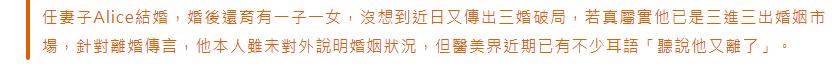 沒想到近日又傳三婚破局,若屬實他已是三進三出婚姻市場。針對離婚傳言,他本人雖未對外說明婚姻狀況,但醫美界近期已有不少耳語「聽說他又離了」。