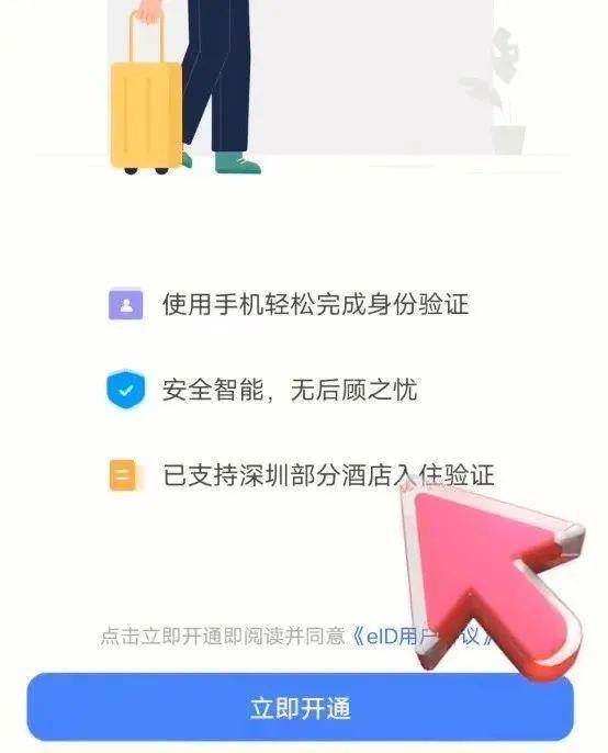 在這里,我們可以看到,歡迎使用eid,手機就是電子證件,線上線下可核驗手機,輕松完成身份驗證,安全智能無后顧之憂。支持部分酒店入住驗證,然后點擊一下立即開通。