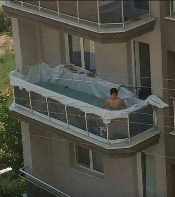 現在大家都是以享受生活為主,還記得很多的學生在宿舍里面搭一個小泳池,是為了降暑,但是現在有很多人為了享受生活,對自家的陽台動了心思,我家小區就有這樣的人存在,偏偏好巧不巧的就正好是我家樓上的住戶,這才搬進來沒多久,本來想串門溝通認識一下,日后有事相互照應,這上樓一看,這樓上的鄰居正在我家房子上面的陽台造水池!這可嚇得我連忙勸阻,這萬一漏水可怎麼辦,退一步再說,這地還不一定能夠承受得住!樓上鄰居仿國外陽台造「泳池」,我家上門勸阻:別亂來,毀了我家!