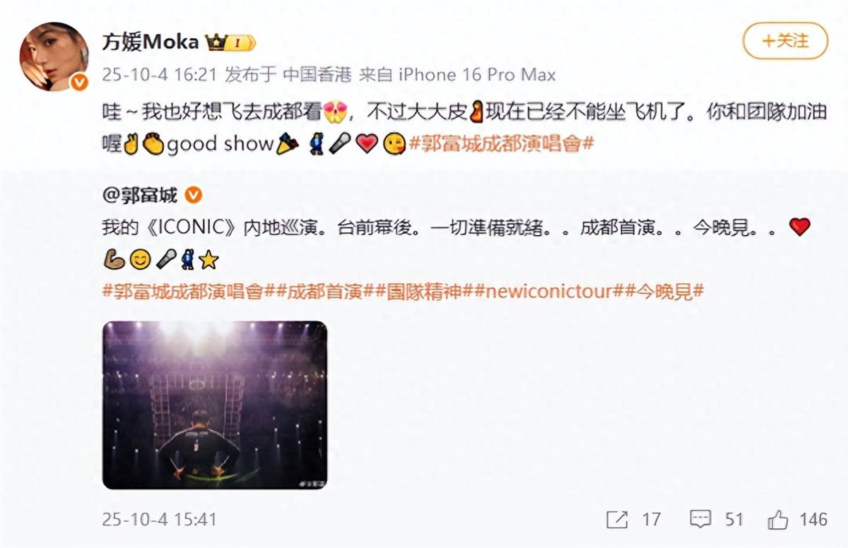 10月4日,方媛發文說郭富城在成都開演唱會,但她因為肚子大無法前去觀看。
