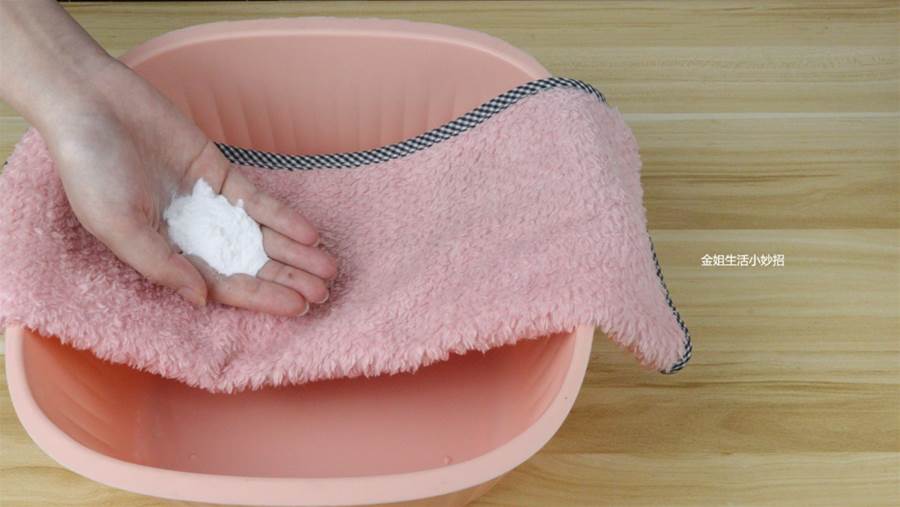 3. 繼續浸泡,加入小蘇打和花露水,搓洗毛巾。