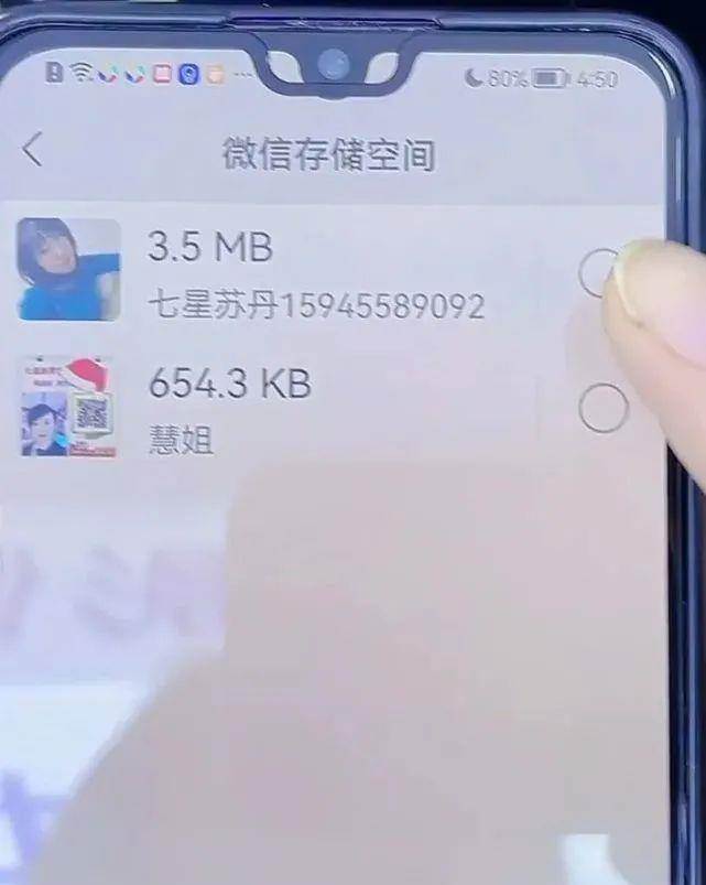 下面,我們再看一下這個聊天記錄所占用的,咱們也點擊一下后面的管理,在這里,我們找到不需要的聊天記錄,然后我們給它選中,選完之后,點擊刪除,這樣我們就清理出了一定的空間,我們在這兒刪除的,一般都是選中每個人的聊天記錄,或者是每個群的聊天記錄,這樣我們就把里面的內容全部刪除了。