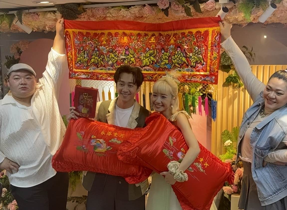 兩人期間還抱著大紅色的鴛鴦枕頭拍照,身后還有喜氣洋洋的傳統喜幛,氣氛感拉滿,老闆送lulu金鏟子,喊話兩人要早生貴子。