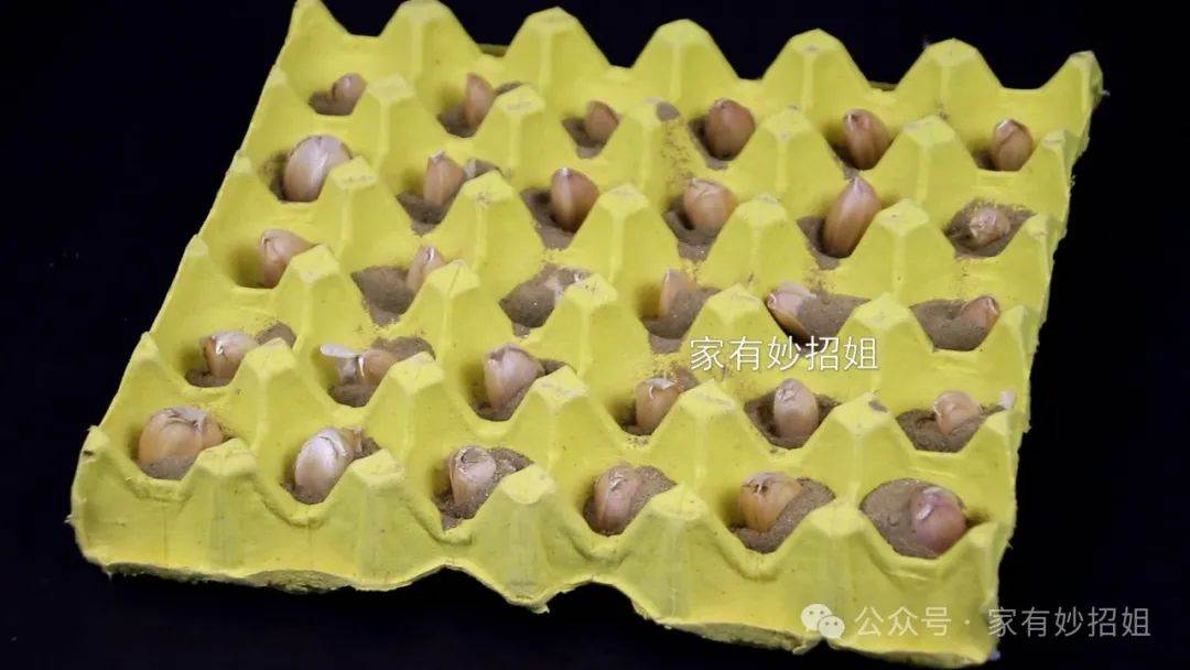 我們注意觀察雞蛋托盤可以發現,它的表面有著很多裝雞蛋的小坑,這些小坑不是很大,但有著一定的深度,用它來種植大蒜就在合適不過了。種植的方法也很簡單,我們只需要在每個雞蛋坑里面都裝上一些營養土,然后準備幾顆大蒜,把大蒜掰成小瓣的。接著在每個雞蛋坑里面都放入一瓣,記得要將大蒜的根部朝下。