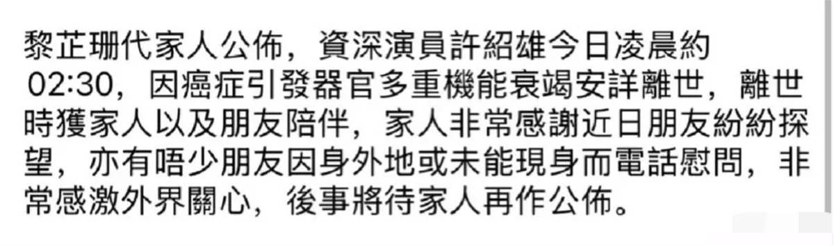 好友透露許紹雄去世的原因:癌癥引發身體多器官衰竭。