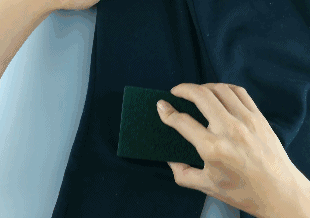 先用百潔布海綿的一面,在衣服粘紙屑的地方輕輕刷一刷,紙屑毛毛一類的就統統被刷下來了。