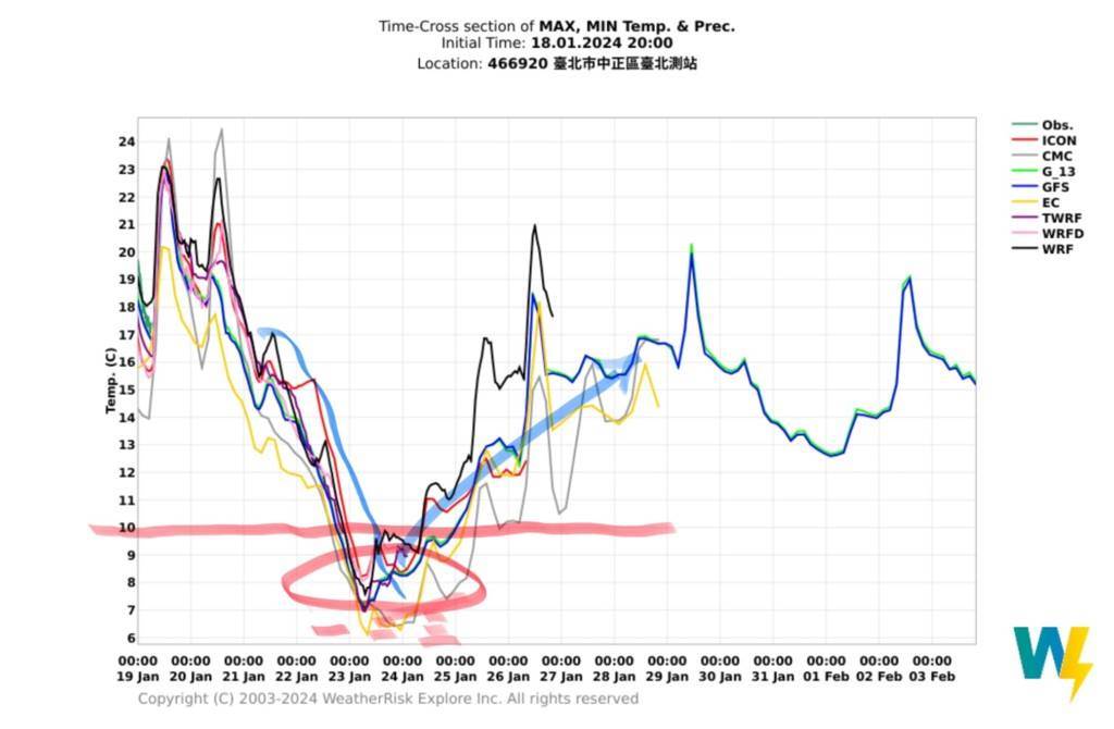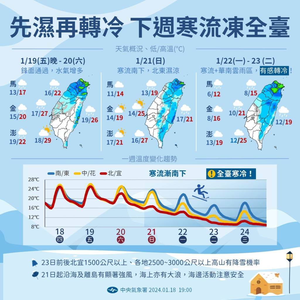 至于民眾最關心的最強寒流將在周日 (21) 報到,到下周三 (24) 全台溫度一路下降,下周一 (22) 又受及華南雲雨區影響,又濕又冷,週三 (24) 才逐漸轉乾。而最冷時間落在下周二 (23) 到下周四 (25) 清晨,其中下周三 (24) 因0度線卡在台灣北端,屆時新竹市、苗栗縣體感溫度最低恐只有1度。