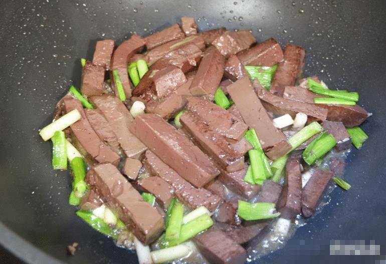 炒豬血也是一個技術活,豬血要蔥姜蒜爆香,大火翻炒豬血,加上一些料酒和干辣椒,快速翻炒,加上一些青蒜,然后調配一些喜歡的調味品,翻炒入味即可。