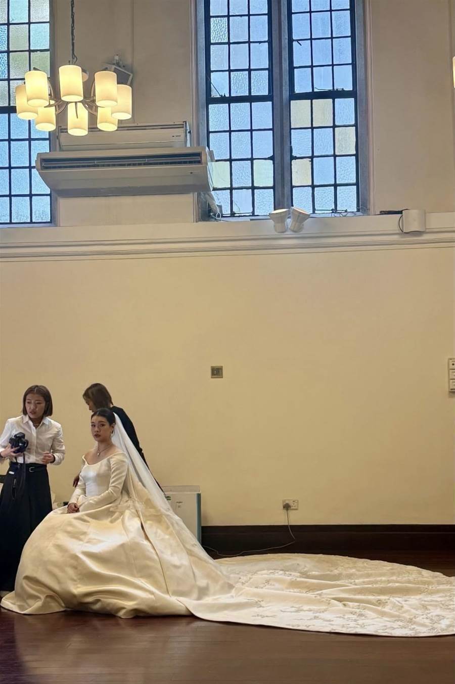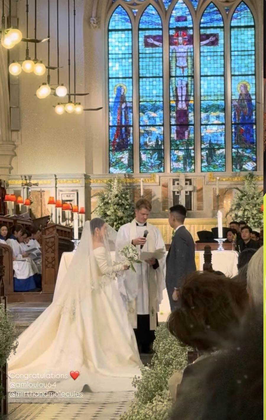 婚禮儀式是在教堂舉行。雷正殷身穿白色的婚紗,頭戴白紗,手捧著白色的花束,挽著其父親雷禮權的手臂,緩緩步入教堂。雷禮權也是名流出身,氣度不凡,他穿著灰色的長款禮服握著女兒的手,面帶笑容,從容而有型地將女兒送嫁。教堂中在神父以及眾位親友的見證下,雷正殷與丈夫交換戒指,宣讀誓詞,之後相擁親吻,完成西方婚禮儀式。