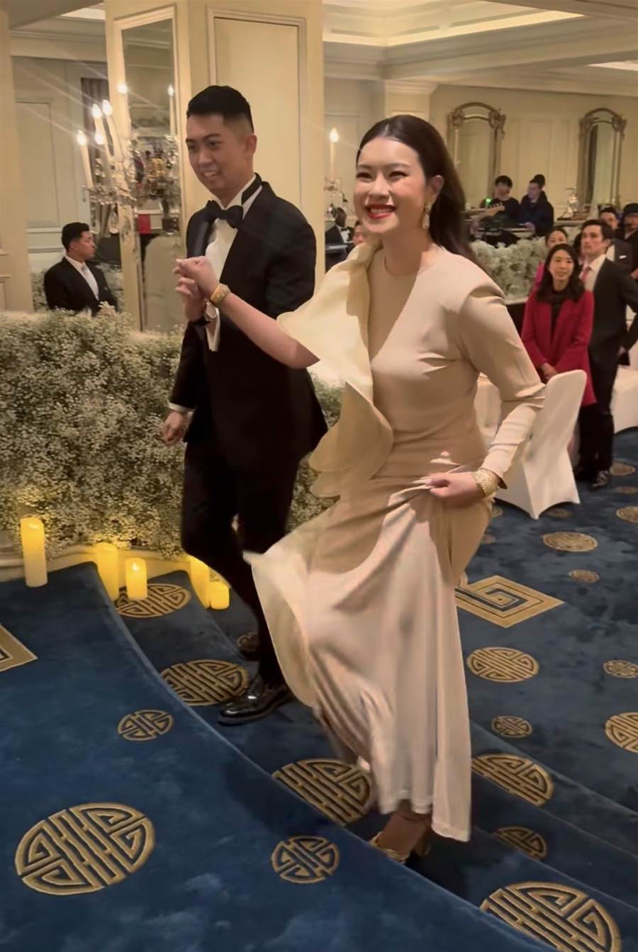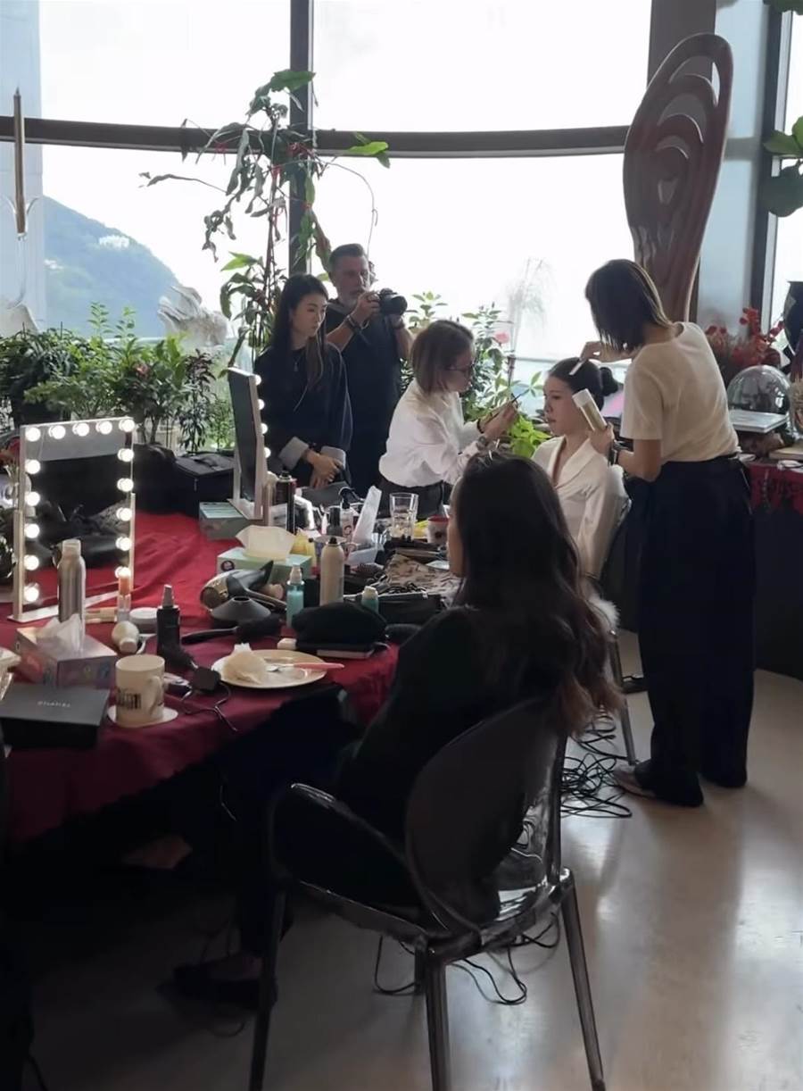 婚禮從早上就開始,在雷正殷孃家的超級豪宅中,以接親儀式開始。為方便給新娘、伴娘化妝,大宅的圓形飯廳被臨時用作化妝間,這個超級飯廳以圓柱形的造型設計,有180度的無敵景觀,相當壯觀。新娘與伴娘就在此化妝,從現場看到,大宅四處都貼上了紅雙囍,就連化妝桌的桌布都是大紅色的,非常喜慶。