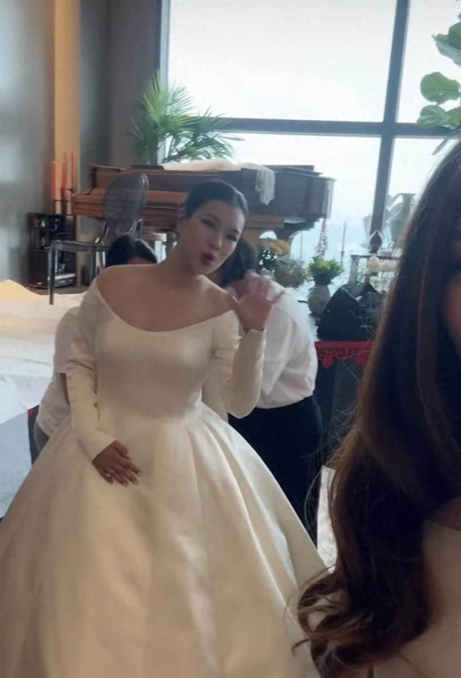 雷正殷穿著白色的露肩婚紗,正在等待新郎的接親,全家上下喜氣洋洋。雷正殷的這件婚紗看似簡單,實則非常隆重、大氣,設計上以簡約為主,內襯至少有三層,而後擺又長又大,可見造價不菲,畢竟是大戶人家嫁女,自然要多大氣有多大氣。