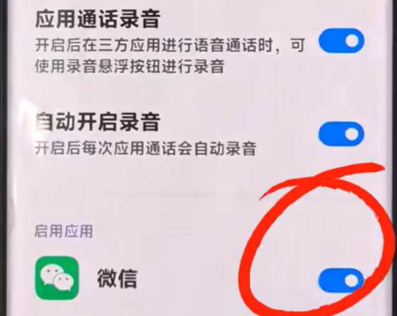 接下來,指定需要自動錄音的應用,將「微信」后面的開關打開。設置完畢后,在進行微信通話時,您會發現屏幕右下角出現了一個帶有時間顯示的錄音懸浮按鈕,表示已自動啟動通話錄音,無需手動操作。