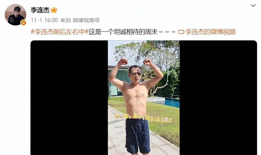 2025年11月1日,李連杰在個人社交賬號發布了一段名為「坦誠相待的周末」的視訊,直接光著膀子在泳池邊展示身材。