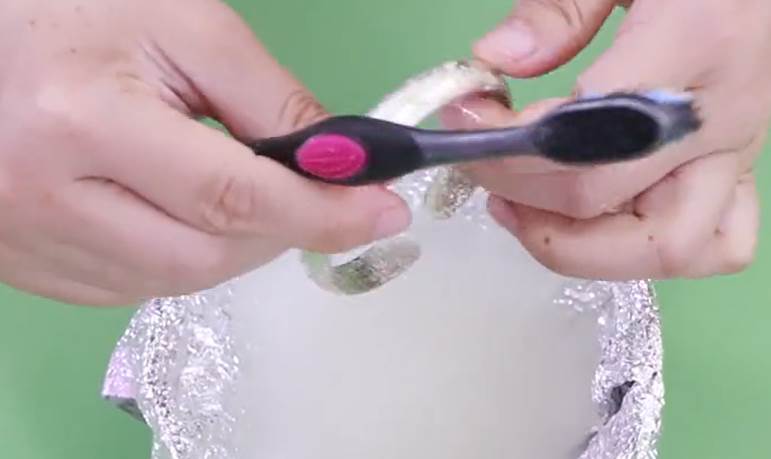 接下來,準備一把牙刷,輕輕刷洗幾下,現在就是見證奇跡的時刻了,我們清洗掉牙膏,看一下手鐲是否像新的一樣變得閃閃發光。
