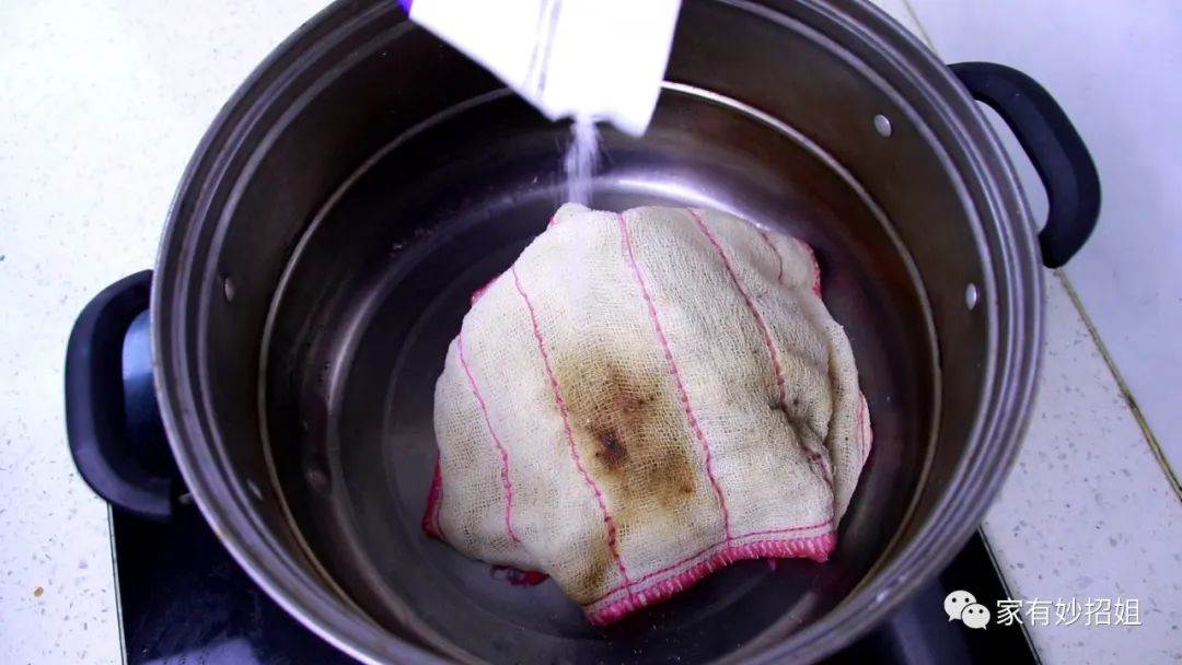 抹布使用上一段時間后,上面就會積累很多的油垢,這些油垢用洗潔精是沒辦法將它洗干凈的。這個時候我們可以將臟的抹布放在一個不常用的舊鍋里,然后還需要往里面倒入一點食鹽和一些食用純堿。