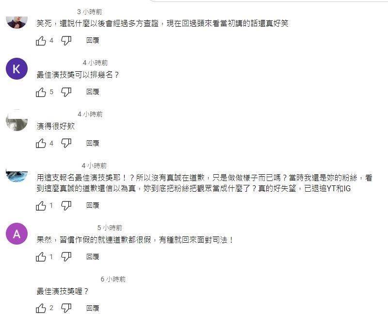 消息一出,許多網友紛紛灌爆愛莉莎莎2年前的道歉影片,留言痛批「最佳演技獎可以排幾名?」、「用這支報名最佳演技獎耶!?所以沒有真誠在道歉,只是做做樣子而已嗎?當時我還是妳的粉絲,看到這麼真誠的道歉還信以為真,妳到底把粉絲把觀眾當成什麼了?真的好失望,已退追YT和IG」、「果然,習慣作假的就連道歉都很假」、「好噁心,最佳演技獎? 謠池金母都這樣騙流量ㄉ」、「天啊,實在是太令人作噁,搞了老半天,是這種心態與態度,在拍攝所謂的道歉?乾脆點,離開退出這個圈子吧!看樣子感覺沒長進也沒成長,根本無心悔改」。