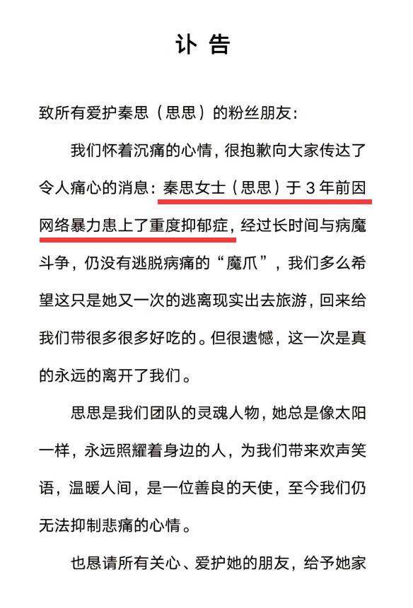 1月17日,家屬發出訃聞,證實秦思已經在15日墜樓輕生,「秦思女士于3年前因網路暴力患上重度憂鬱癥,經過長時間與病魔鬥爭,仍沒有逃過病痛的魔爪」、「很遺憾,這次是真的永遠地離開了我們」