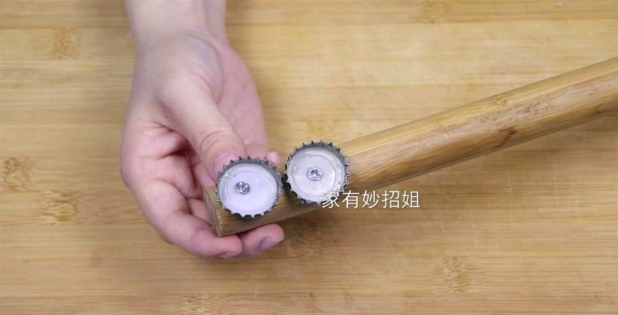 我們先準備一根粗一點的棍子,像家里的搟面杖,如果廢棄不用的話,就可以利用上搟面杖也是一樣的。我們把2個啤酒瓶蓋并排著放在搟面杖的一端,然后再用兩個螺絲釘分別把啤酒瓶蓋都固定在搟面杖上,那麼這樣一個刮魚鱗的神器就制作好了。
