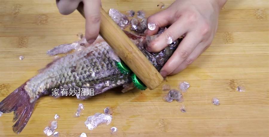 接著,我們再將魚放在案板上,然后一手按住魚身,把魚固定住,另一只手抓住搟面杖沒有固定啤酒瓶蓋的一端,把另一端的瓶蓋從魚尾處往上刮。簡單的刮幾下,我們就會看到,魚鱗大把大把的往下掉。