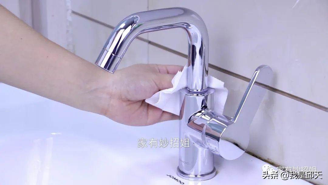 簡單地擦拭幾下,我們就可以看到水龍頭上的水垢都被去除了,變得非常的光亮。