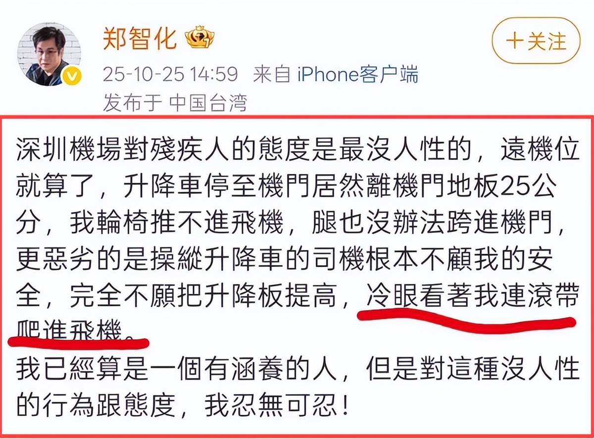 10月25日,鄭智化在社交平台上突然發文,哭訴自己遭到「歧視」的不公對待。