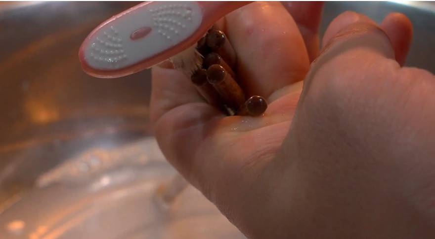 揉搓好以后,我們取一根牙刷,把筷子落在手中,我們把筷子頭給它清洗一下,用牙刷把筷子頭這樣給它清洗,因為筷子頭我們經常要用到接觸食物,所以,一定要用牙刷給它擦干凈。