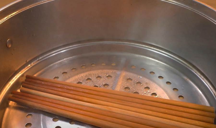 我們把筷子撈出來,再用清水給它清洗一遍,筷子清洗干凈以后,我們撈出來放到蒸籠中,把筷子給它鋪開,在蒸籠里面給它蒸15分鐘。