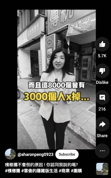 網紅團購主雪倫表示,近幾年檳榔攤倒了不少,因為台灣每年有8千人罹患口腔癌,其中3千人不治,政府不斷地呼籲「少吃檳榔」,以前大約有200萬人在吃,現在大概剩60萬。不過,雪倫話鋒一轉,即便掉到60萬,人口還是很多,一年的生產價值高達100多億元,全台灣的檳榔種植面積約為1.5個台北市的大小,與檳榔產業相關的人口為50萬,「也是滿多的!」