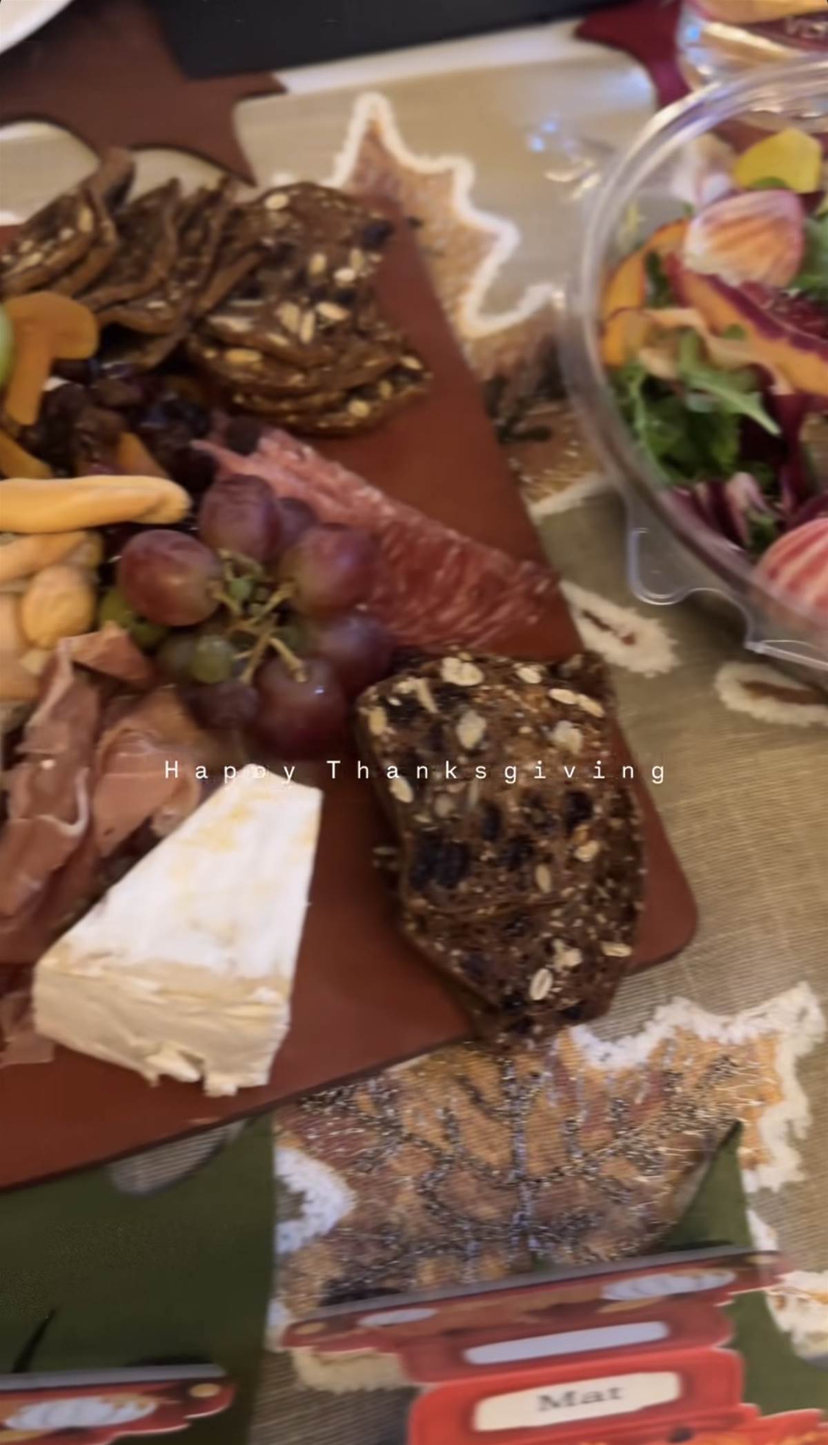 沒有那種很大排場的過節陣仗,但是儀式感不少,氛圍也很充足。在過節前,她與男友特別剪出了很多楓葉形狀紙片,放在餐桌上,當成桌布一般。而在餐桌上,擺放了很多的食物,本來按照傳統,是要吃烤火雞慶祝的,但應該考慮到孩子、老人,從謝婷婷曬出的食物來看,多以色拉為主等輕食,有葡萄、提子等水果,還有面包、奶酪,火腿肉片,蛋糕、餅干,當然還有熱湯與紅酒,總之相當豐盛。