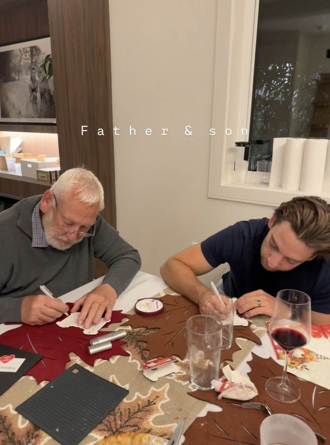 特別值得一提的是,在家庭感恩節當天,除了謝婷婷與男友一家人四口外,男友Mathew的父親也一起參與了聚會。謝婷婷的男友比她小7歲,也就是36歲,不過其男友的父親已經白發蒼蒼,只見他穿戴整齊,戴了一副眼鏡,他的頭髮以及絡腮胡都白了,看起來很慈祥,估計年齡也有70歲了。男友的父親也參與了感恩節卡片的制作,父子倆一同在寫感恩節的卡片,畫面溫馨,在制作的期間,父子倆還喝了紅酒。