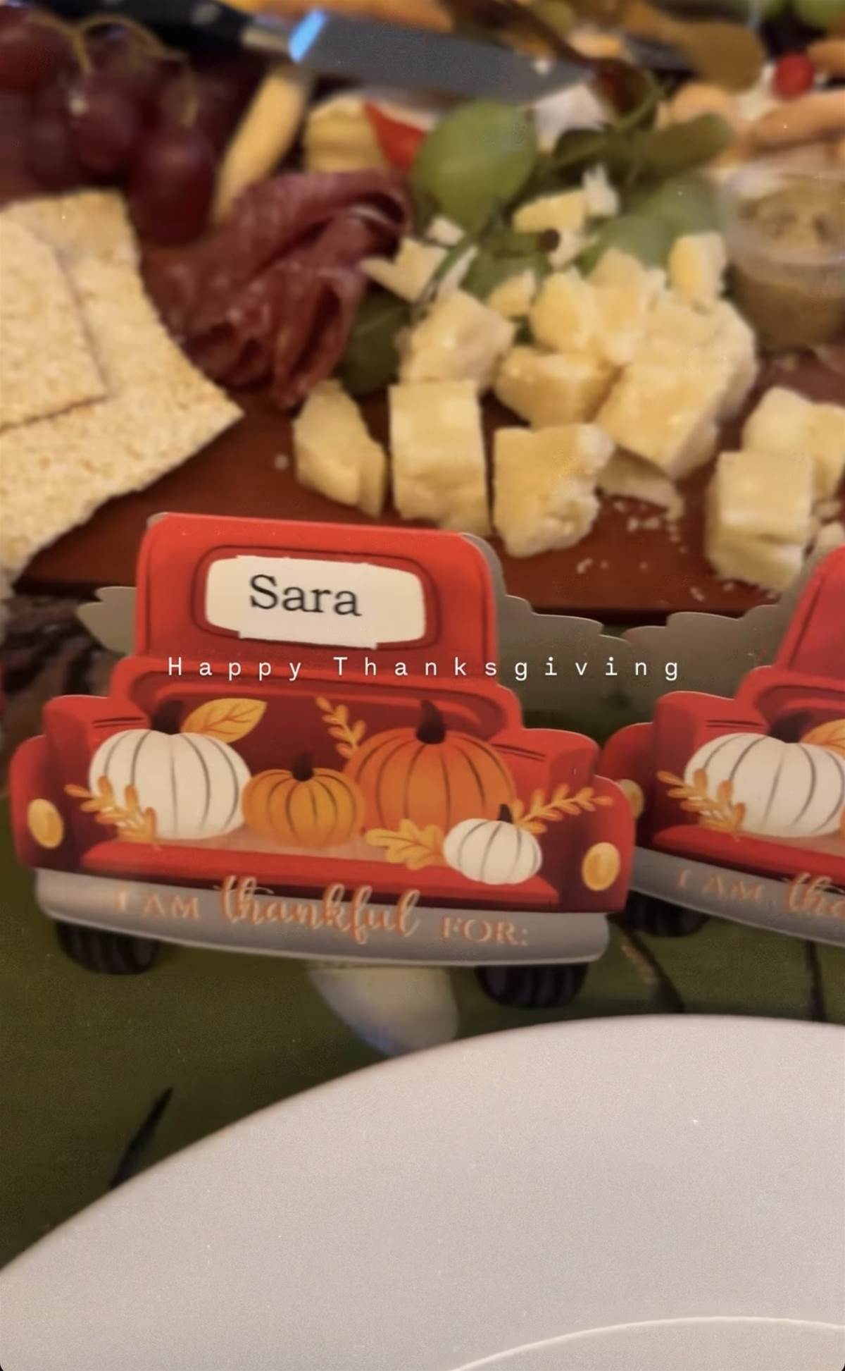 從被曝光的照片來看,謝婷婷、謝婷婷的男友以及兒子、女兒的名字都被寫到了卡片上,這些都是家人,也是她最想感謝的人。一家人團聚慶祝感恩節,才出生的兒子因為年紀太小沒有上桌,但是都在同一個屋檐下,自然顯得無比溫馨與熱鬧。吃飯的時候,謝婷婷還專門拍攝了男友Mathew的特寫,他很應景地戴上了一頂火雞帽,十分有趣兼可愛。