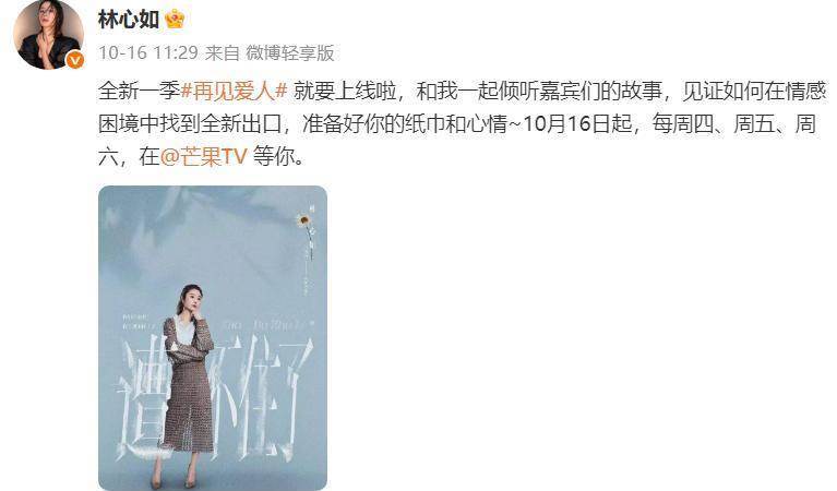 10月16號,心如在自己的社交賬號上發布了一張照片,內容是參加的《再見愛人》要播了。