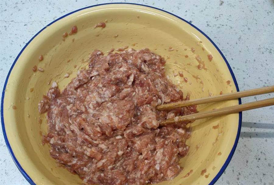 把豬肉去皮后剁成肉餡,放在盆中,接著就可以開始調味了,根據自己的口味加入適量鹽、花椒粉、胡椒粉、生抽、蠔油、少許老抽,然后用筷子朝一個方向攪拌,把調料攪拌均勻。調餃子餡想要鮮嫩流汁,打水一定少不了,想要肉餡吃入更多的水分,就一定要先加鹽來調味,先加鹽可以使肉的蛋白質凝固,從而可以吸收更多的水分。