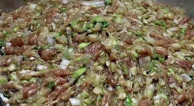 肉餡經過調味和打水后,最后還要進行封油處理,封油可以鎖住肉餡中的水分和鮮香味,使餃子餡鮮嫩多汁;一斤肉餡需要加50-100克左右的料油(料油的做法分享在文章末尾),攪拌均勻后再加入適量蔥花和姜末,肉餡就調好了。然后根據自己的口味搭配蔬菜,如果是水分含量大的蔬菜,一定要提前進行殺水、控水處理。