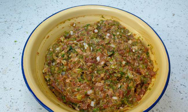 肉餡打水,最好是骨頭湯或者雞湯,沒有的話可以用蔥姜水或者花椒水來代替,一斤肉餡打入4兩左右的水分為宜,打水要分三次加入,每次加入水以后朝一個方向攪打,使肉餡完全把水分吸收后再次進行打水,水分全部打入肉餡中后,肉餡的狀態非常飽滿而且有光澤。