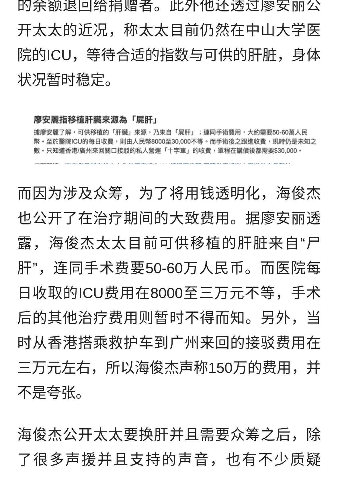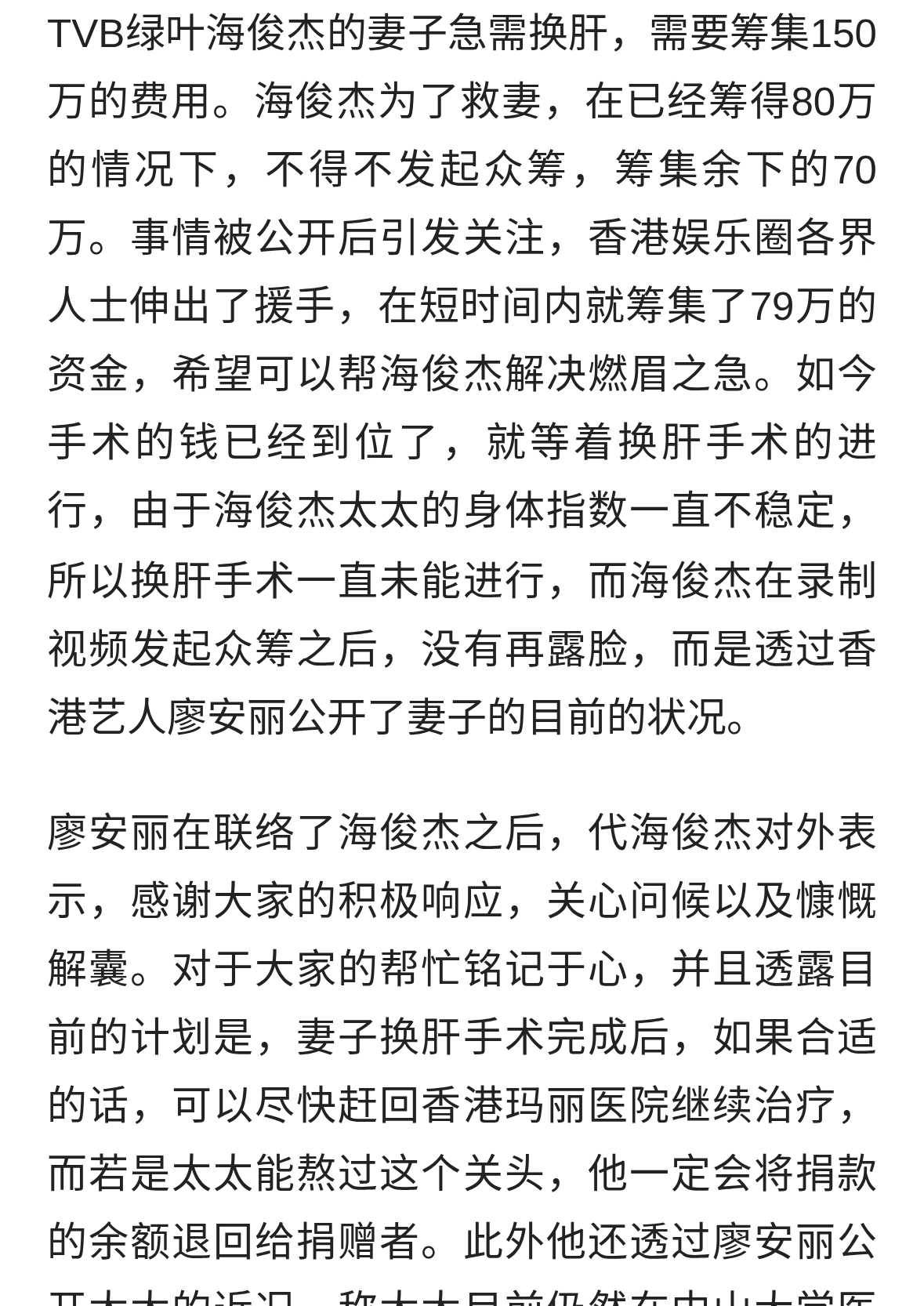 11月8日夜間,TVB演員海俊杰發布視訊,稱太太莫家慈因患急性肝硬化,聲淚俱下地向網友求助,為太太籌集150萬港幣的肝臟移植手術費。視訊曝光,在網上引發關注。