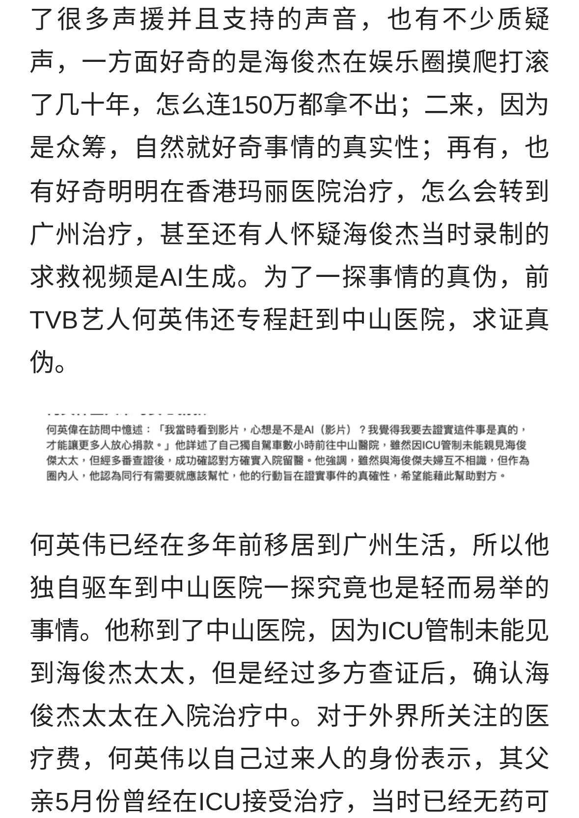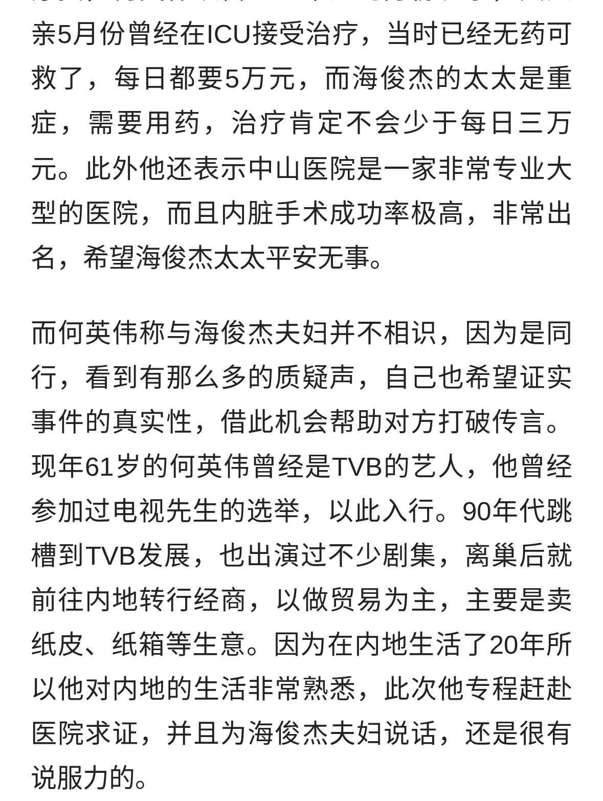 另據紅星新聞消息,11月11日,TVB演員海俊杰曬出與妻子在病床前牽手照片,并發文再次談及妻子病情。他稱,「由于可能有機會進行配對(肝臟移植),我也需要了解手術建議及醫療費用。