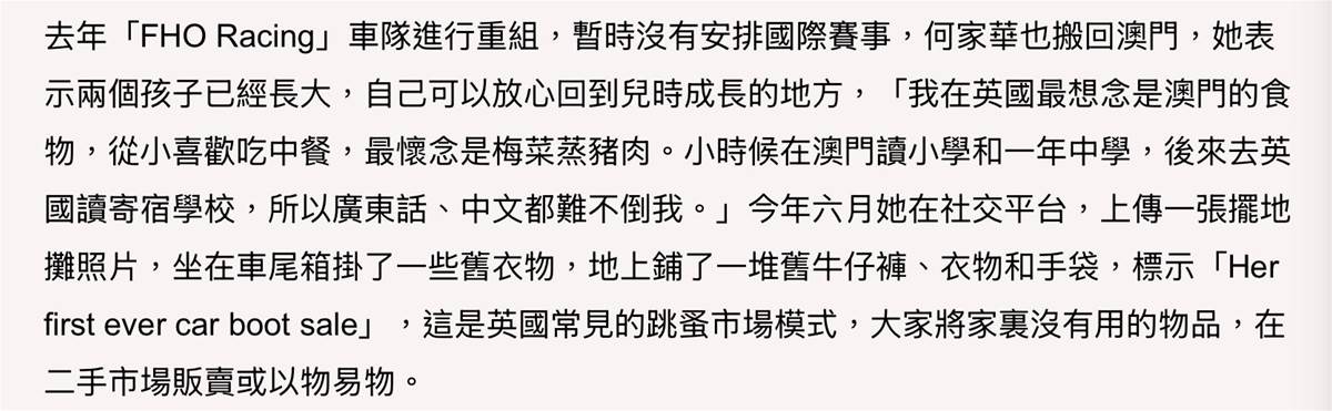 何家華因為長期現身在澳門,不時在一些公開場合亮相,引發了媒體關注,加上在之前她曬出了在倫敦街頭擺賣的照片,引起了討論,于是有媒體專程采訪她,而她也大方地公開了個人近況。
