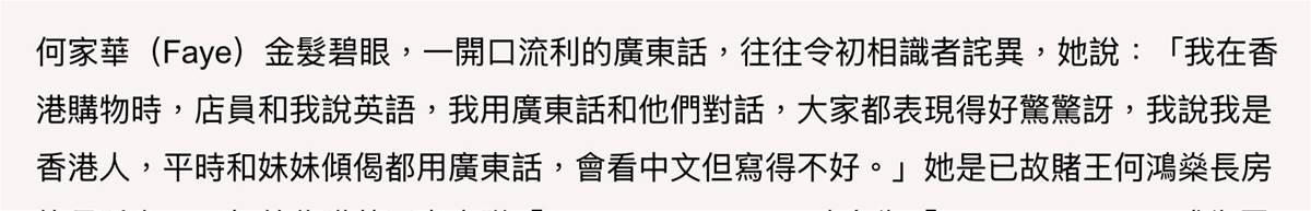 何鴻燊的四個妻房中,長房的存在感是最低的,這大概也是因為這一房的成員的成員所剩無幾,且都頗為低調,并且不參與家族的任何事務。何鴻燊長房的第三代成員中,兩個孫女多年來一直有不小的關注點,她們兩個都各有各的生活,且在社交平台上活躍,尤其是長孫女何家華,依然活躍在社交平台上,以自己的方式分享當下的生活。近年來何家華頻頻現身澳門,起初以為她只是回來探親,原來她已經在悄然中搬回了澳門生活,并且在當地有了工作。