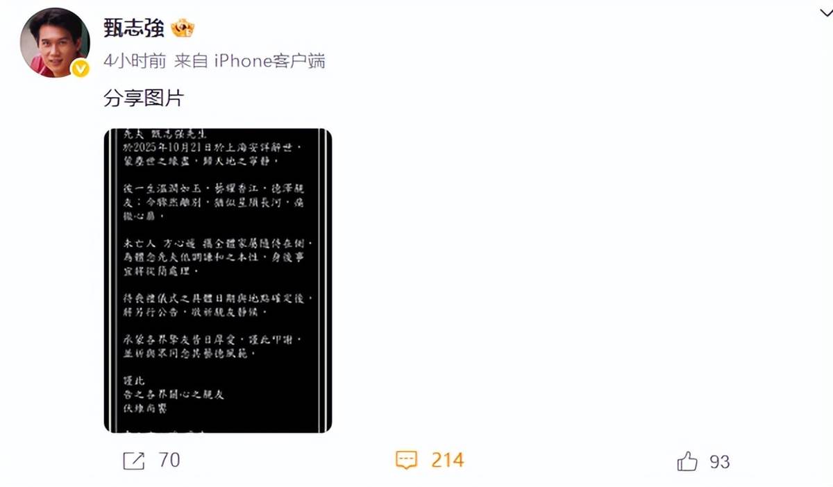 沒想到時間才過不到一天,他就安詳的離開了這個世界,是妻子方心媛在今天公布他的死訊。