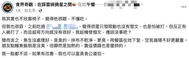 「食界奇觀:在踩雷與摘星之間」開酸,自己很孬,之前吃過,覺得很雷,只發限動沒有發文,也是怕被打,「但反正有人被打了,而且超哥方向感沒有很好,我趁機發個文,應該沒事吧?」